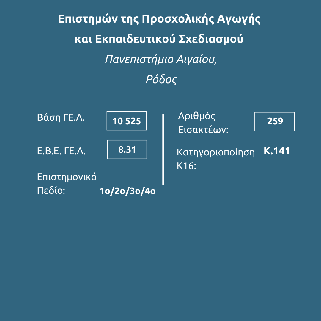 Στο τμήμα Επιστημών της Προσχολικής Αγωγής & Εκπαιδευτικού Σχεδιασμού στο Πανεπιστήμιο Αιγαίου το πρόγραμμα Σπουδών οργανώνεται γύρω από πέντε (5) επιστημονικά πεδία:
