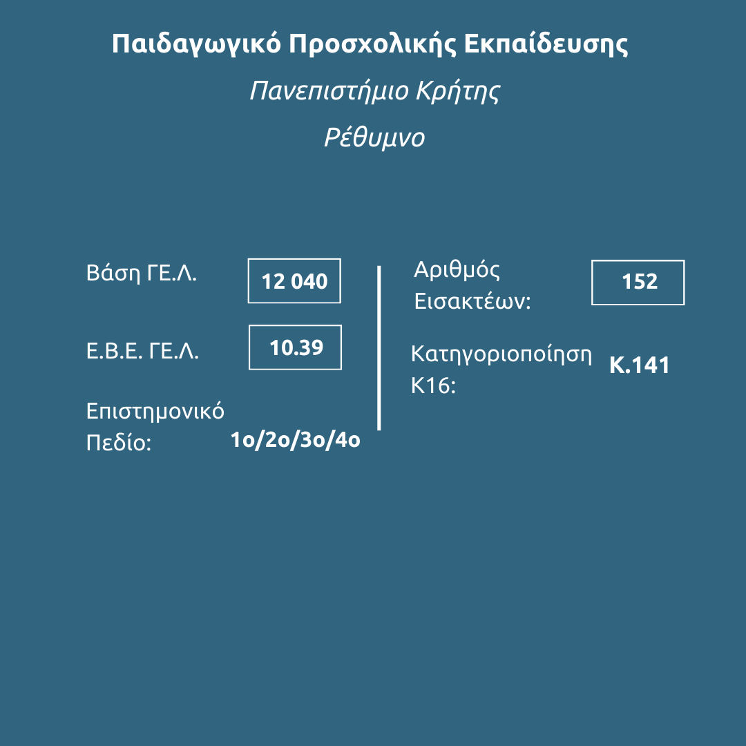 Στο Παιδαγωγικό Τμήμα Προσχολικής Εκπαίδευσης στο Πανεπιστήμιο Κρήτης τα προσφερόμενα μαθήματα χωρίζονται σε ενότητες: