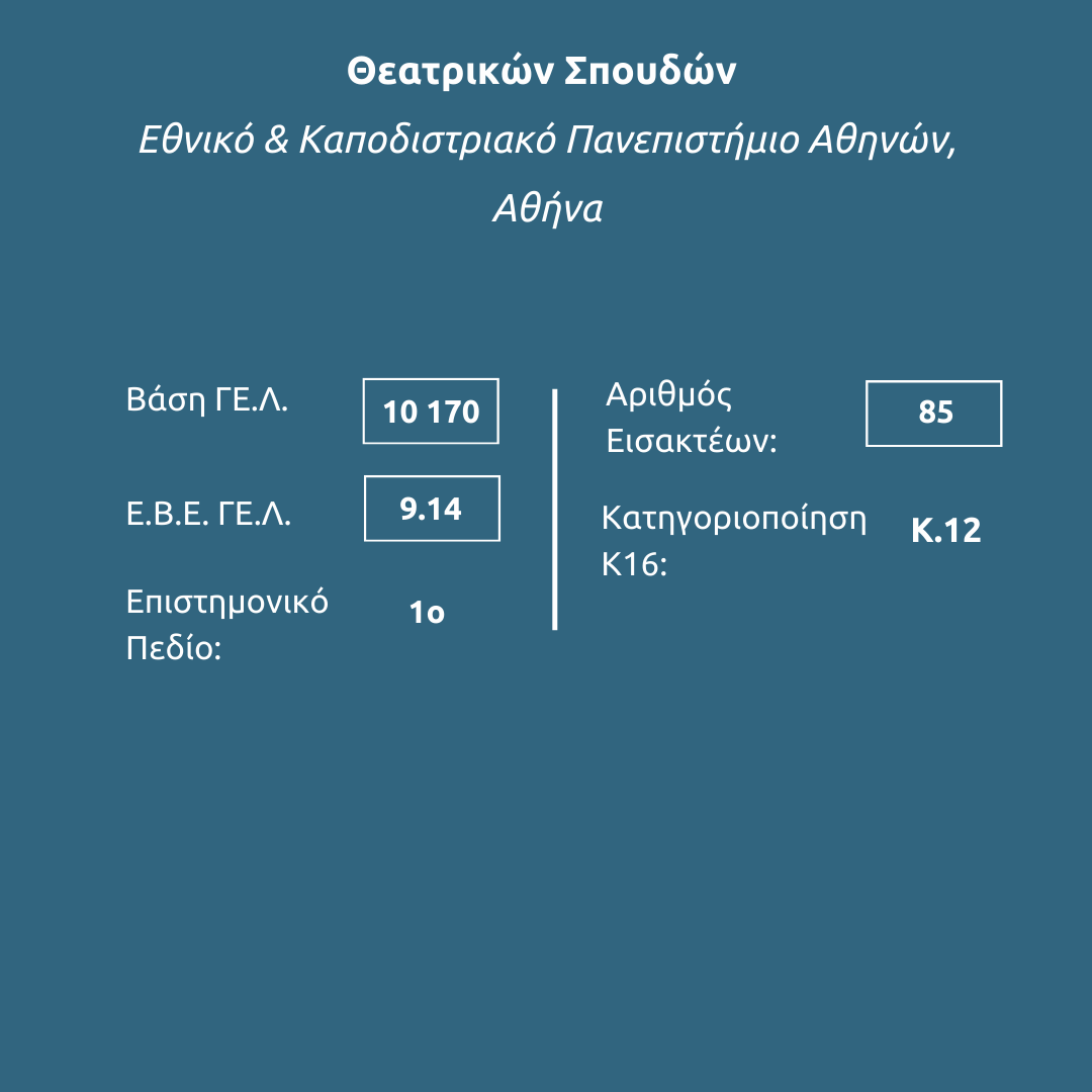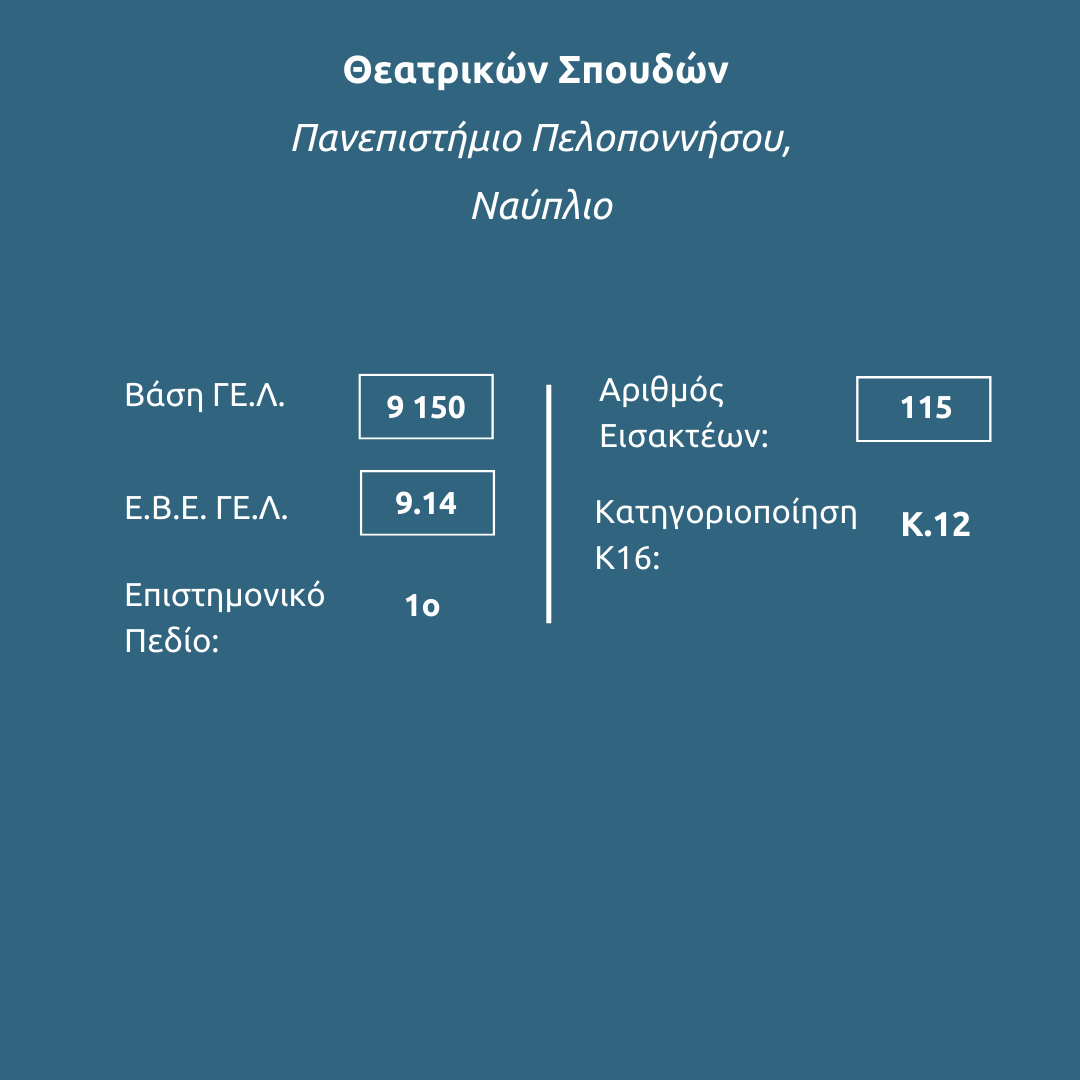 Εισαγωγή στο Αρχαίο Θέατρο, Εισαγωγή στις Θεατρικές Σπουδές , Νεοελληνική Ιστορία, Χορός: Σύνθεση-Αυτοσχεδιασμός Ι, Κριτική Ανάλυση Παραστάσεων Ι, Παιδαγωγική του Θεάτρου Ι: H Διδακτική του Θεάτρου στην Εκπαίδευση , Θεωρία Θεάτρου, Εισαγωγή στη Σκηνοθεσία- Θεωρία και Πράξη, Θέματα Ιστορίας και Δραματολογίας του Νεοελληνικού Θεάτρου, Ζητήματα Πρόσληψης του Αρχαίου Δράματος, Αρχαία Θέατρα, Σκηνοθετικά Ρεύματα: Θεωρία και Εφαρμογές,Θεωρία και πράξη της διδακτικής του θεάτρου στην πρωτοβάθμια και δευτεροβάθμια εκπαίδευση,Παιδαγωγική του Θεάτρου IΙI: Η Αναπτυξιακή Διάσταση της Διδακτικής του Θεάτρου στην Εκπαίδευση, Το Ένδυμα στις Παραστατικές Τέχνες: Εισαγωγικές Έννοιες, Εισαγωγή στον Θεατρικό Φωτισμό: Πρακτικές Εφαρμογές,Μεθοδολογία της Θεατρολογικής Έρευνας.